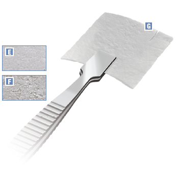 alloguide gf has 2 distinct sides: Amnion (E) and Chorion (F). The Amnion side is smooth while the Chorion side is rough. The graft has one orientation guide-slit (G) that when positioned on the top right, the Amnion side is facing upward (towards you). Trim excess graft as necessary.