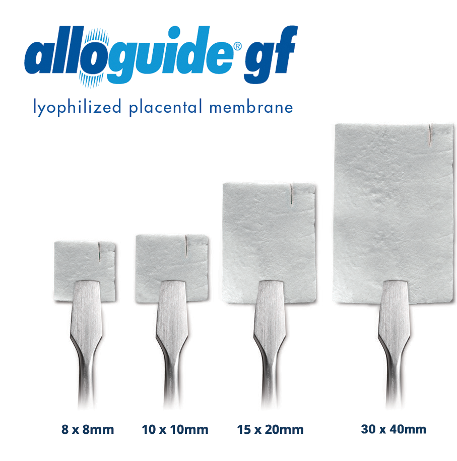 alloguide gf is a lyophilized placental membrane that preserves its endogenous growth factors associated with the repair of oral wounds. alloguide gf is an ideal membrane to support Guided Tissue Regeneration (GTR) and Guided Bone Regeneration (GBR) dental procedures as it retains the high levels of regenerative growth factors naturally present in the placental membrane.