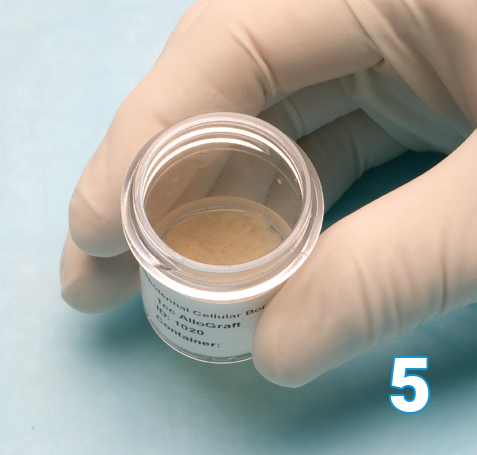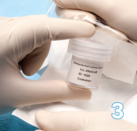 A sterile scrub person removes the Osteocel Plus container from the peel pack without compromising sterility.