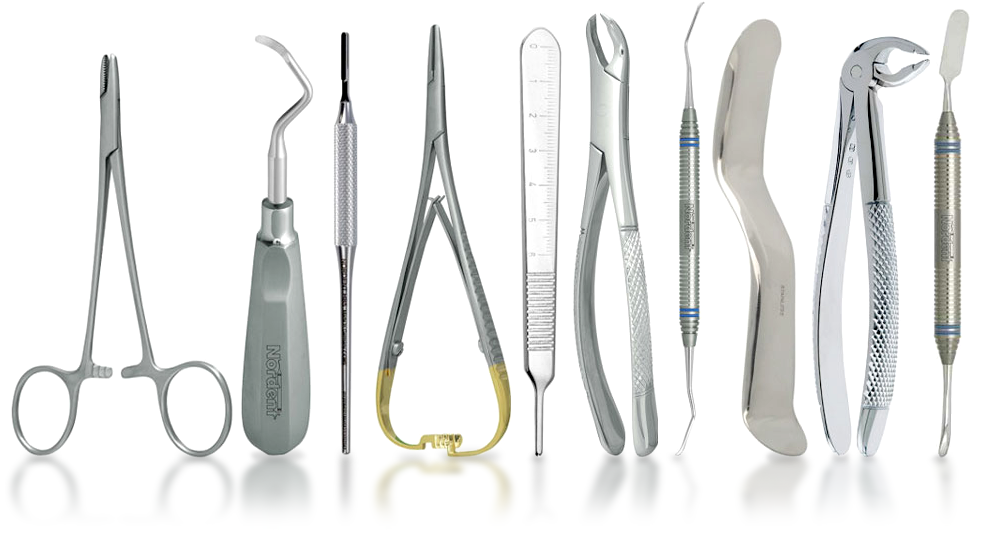 Periosteal elevators, retractors, rongeurs, suction tips, elevators, extraction forceps, scissors, needle holders, mirrors, and more.